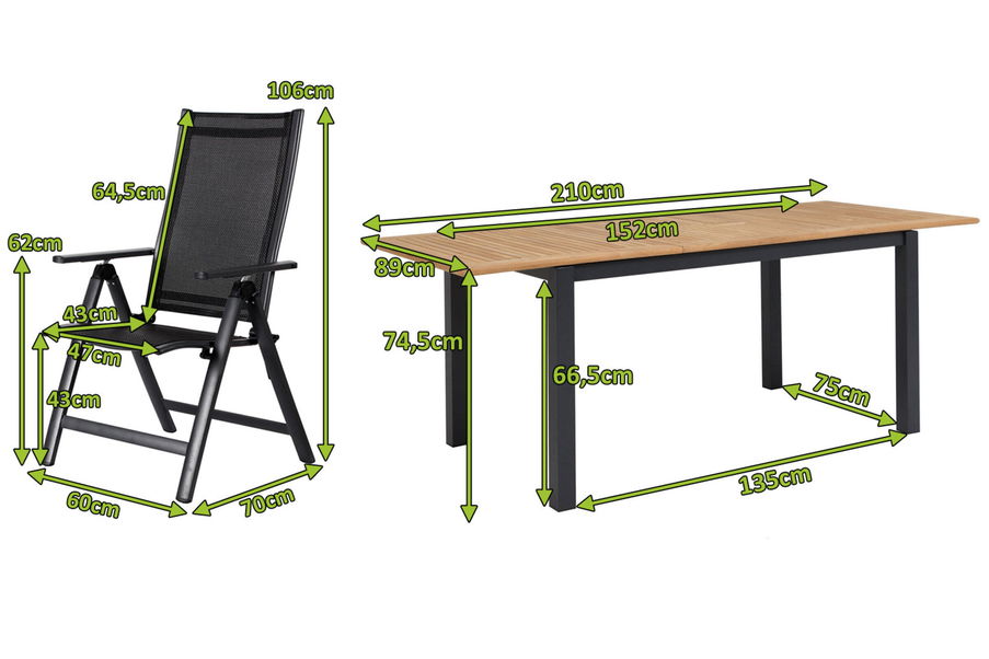 Zum richtigen Highlight werden die 8 Klappstühle und der innovative Ausziehtisch wenn spontan Besuch vor der Tür steht. Je nach Bedarf lässt sich die ca. 152 cm lange Tischplatte auf bis zu ca. 210 cm vergrößern und bietet Ihnen somit reichlich Platz für 6 - 8 Personen. Dank Synchronauszug mit Butterfly-Funktion ziehen Sie einfach an einem Tischende und beide Tischplattenhälften fahren parallel auseinander, so dass die tiefer gelegene Verlängerungsplatte in der Mitte erscheint. Diese positioniert sich beim Aufklappen dann automatisch in der richtigen Höhe. Nun ziehen Sie nur noch beide Tischenden wieder Richtung Tischmitte und die Hälften verbinden sich mit der Verlängerungsplatte. Verkleinert wird der Tisch genauso mühelos. Der ca. 28,25 kg schwere Tisch mit Gesamtmaßen von ca. 152/210 x 89 x 74,5 cm ist auch äußerst stabil. Die ca. 2 cm dicke Tischplatte aus wiederverwertetem Teakholz macht diesen wunderschönen Tisch zum Blickfang. Sie harmoniert perfekt mit dem modernen Gestell aus pulverbeschichtetem Aluminium in der Farbe “anthrazit matt”. Die natürliche Wärme des Holzes verleiht dem Esstisch einen ganz besonderen Charme, der von der allmählichen Patinabildung in einem schönen Silbergrau noch unterstrichen wird. Wenn Sie diesem Prozess jedoch entgegen wirken möchten empfehlen wir Ihnen eines unserer Pflegeöle, welches Sie im Zubehör finden. Ganz gleich, was Sie vorhaben – ob Brunch oder gemütlicher Spieleabend – der elegante, rechteckige Tisch bietet Ihnen immer das passende Ambiente.