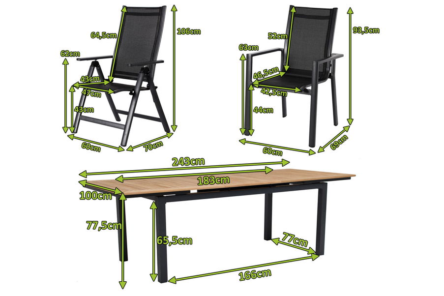 Mit Gesamtmaßen von ca. 183/243 x 100 x 77,5 cm ist der ca. 33,75 kg schwere Tisch auch äußerst stabil. Die ca. 2 cm dicke Tischplatte aus wiederverwertetem Teakholz macht diesen wunderschönen Tisch zum Blickfang. Sie harmoniert perfekt mit dem modernen Gestell. Die natürliche Wärme des Holzes verleiht dem Esstisch einen ganz besonderen Charme, der von der allmählichen Patinabildung in einem schönen Silbergrau noch unterstrichen wird. Wenn Sie der Patinabildung entgegen wirken möchten empfehlen wir Ihnen eines unserer Pflegeöle, welches Sie im Zubehör finden. Alle Gestelle sind solide gearbeitet und bestehen aus korrosionsbeständigem Aluminium im schicken “anthrazit matt”. Die Sitz- und Rückenflächen der Sessel sind mit Textilene im passenden Schwarzton bespannt. Das Material ist unglaublich sorgt für ein herrlich luftiges Sitzgefühl, das Sie auch in der Sommerhitze nicht im Stich lässt. Designstarke Armlehnen schenken den Sesseln erhöhten Komfort. Die Gesamtmaße der Stapelsessel liegen jeweils bei ca. 60 x 69 x 93,5 cm mit einem Gewicht von ca. 3,2 kg. Die Klappstühle wiegen jeweils ca. 5 kg bei Maßen von ca. 60 x 70 x 106 cm. Alle Sessel sind dank der hohen Qualität und hochwertigen Verarbeitung bis ca. 130 kg belastbar. Bei Nichtgebrauch können Sie die Sitzmöbel auch einfach stapeln oder zusammenklappen und platzsparend verstauen.
