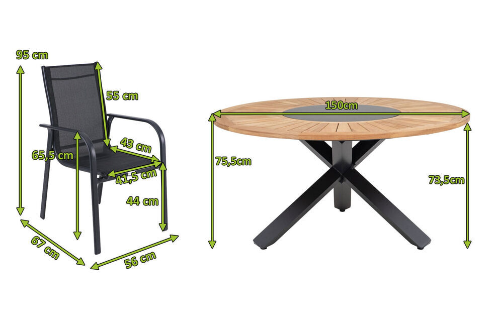 Die Haltbarkeit der erstklassigen Materialien wird Sie begeistern: sie verleihen der Esstischgruppe nicht nur Pflegeleichtigkeit, sondern auch Witterungsbeständigkeit, so dass sie jedem Wetter trotzen. Die Aluminium-Gestelle in der Trendfarbe “anthrazit matt” sind gegen jegliche Umwelteinflüsse gefeit und ihre Pulverbeschichtung verleiht ihnen zudem Stoß-, Schlag- und Kratzfestigkeit. FSC®-zertifiziertes Teakholz hat einen natürlichen Schutz gegen Pilze und andere Schädlinge, sodass sich die Pflege auf ein Minimum beschränkt. Außerdem ist das Holz witterungsbeständig und hält auch extreme Temperaturen und Feuchtigkeit aus. Die schnelltrocknende Bespannung der Sessel (Textilene) besteht aus 100 % Polyester, ist besonders UV-beständig, reißfest und verliert nie ihre Form. Oberflächliche Verunreinigungen entfernen Sie direkt mit etwas Wasser, wodurch Sie mehr Zeit für Erholung haben. Zusätzliche Fußkappen vermeiden unschöne Kratzer auf Ihrer Terrasse und bieten zugleich Schutz für Ihre Möbel. Dank der einmaligen Verarbeitung werden Sie über viele Jahre Freude an diesem Set haben.