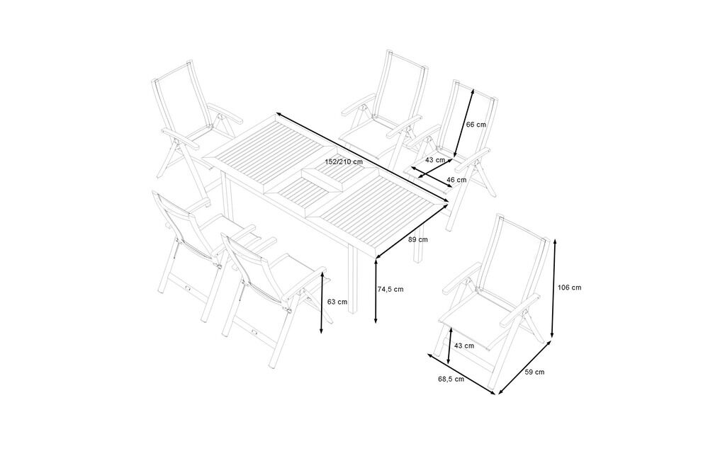 Hochwertige Materialien machen die Esstischgarnitur nicht nur pflegeleicht und witterungsbeständig, sie prägen auch ihr zeitgemäßes Design. Die Aluminium-Gestelle bestehen gegen jegliche Umwelteinflüsse und für die exzellente Stoß-, Schlag- und Kratzfestigkeit sorgt ihre Pulverbeschichtung. FSC®-zertifiziertes Teakholz hat einen natürlichen Schutz gegen Pilze und andere Schädlinge, sodass sich die Pflege auf ein Minimum beschränkt. Außerdem ist das Holz witterungsbeständig und hält auch extreme Temperaturen und Feuchtigkeit aus. Die Sessel-Bespannung (Textilene) besteht aus 100 % Polyester, ist besonders UV-beständig, reißfest und verliert nie ihre Form. Das Material trocknet zudem sehr schnell, weshalb auch Regenschauer Ihr Gartenvergnügen nur kurz unterbrechen. Oberflächliche Verunreinigungen lassen sich auch direkt mit etwas Wasser entfernen und so bleibt Ihnen mehr Zeit für Entspannung. Schutz für die Gestelle und Ihre Terrasse schenken Ihnen die zusätzlichen Fußkappen. Dank der hochwertigen Qualität werden Sie über viele Jahre Freude an Ihrem neuen Dining-Bereich haben.