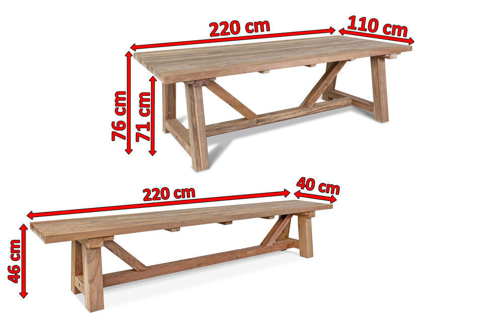 Es benötigt nicht viel Schnickschnack um selbst den anspruchsvollsten Gartenliebhaber zu überzeugen. Das verwendete recycelte Teakholz verleiht diesem Set einen ganz besonderen Charme. Die rustikal gebürstete Oberfläche sorgt dafür, dass die natürliche Struktur des Holzes erhalten bleibt und die Maserung besonders gut zum Vorschein kommt. Das Zusammenspiel aus dieser rustikalen Oberfläche und dem im Landhausstil gefertigten Gestell, verleiht der Esstischgruppe ihr besonderes Aussehen und sorgt dafür, dass sie sich zu nahezu jeder Garteneinrichtung harmonisch kombinieren lässt. Mit den Tischmaßen von ca. 220 x 110 x 76 cm und der dazu passenden Bank (ca. 220 x 40 x 46 cm) bietet dieses Gartenmöbel-Set ausreichend Platz für bis zu 5 Personen. Die Stärke der Tischplatte bzw. der Sitzfläche von ca. 4 cm und die extra dicken Beine und Querstreben unterstreichen das rustikale Design zusätzlich.