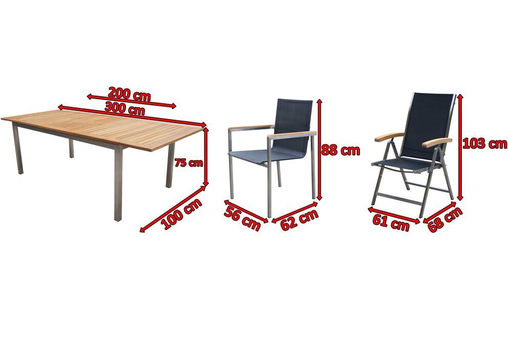 Für ein komfortables Sitzen sorgt die hochwertige textilene Bespannung, die die Sessel auch ohne Auflagen äußerst bequem macht. Außerdem sind die Klappstühle mittels Rasterschiene 4-fach verstellbar, sodass diese je nach Bedarf in eine Sitz- oder Liegeposition gebracht werden können. Das zeitlose Design aus einem rostfreien Edelstahlgestell mit einer Bespannung in der Farbe schwarz, machen die Sessel zu einem optischen Highlight für jede Terrasse. Armlehnen aus Teakholz ergänzen das edle Design. Dank der verwendeten Materialien haben die Sessel ein sehr geringes Gewicht, was ein leichtes Umstellen oder Verschieben ermöglicht. Bei Bedarf können die Sessel schnell und einfach zusammengeklappt und platzsparend verstaut werden.