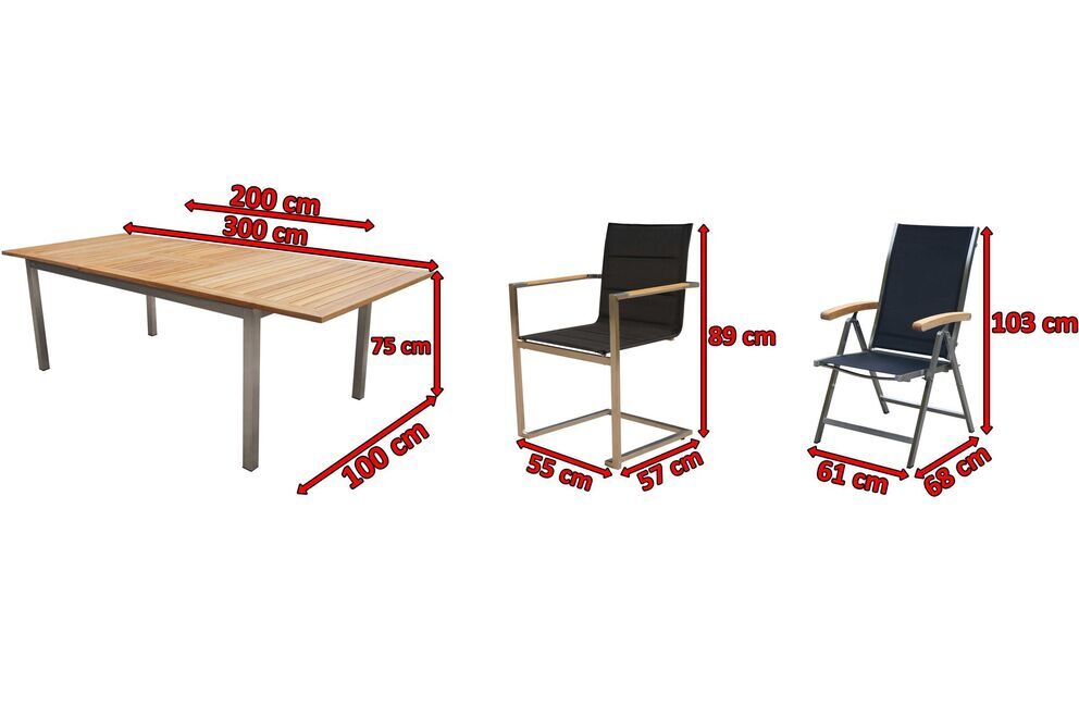 Für ein komfortables Sitzen sorgt die hochwertige textilene Bespannung, die die Sessel auch ohne Auflagen äußerst bequem macht. Außerdem sind die Klappstühle mittels Rasterschiene 4-fach verstellbar, sodass diese je nach Bedarf in eine Sitz- oder Liegeposition gebracht werden können. Das zeitlose Design aus einem rostfreien Edelstahlgestell mit einer Bespannung in der Farbe schwarz, machen die Sessel zu einem optischen Highlight für jede Terrasse. Armlehnen aus Teakholz ergänzen das edle Design. Dank der verwendeten Materialien haben die Sessel ein sehr geringes Gewicht, was ein leichtes Umstellen oder Verschieben ermöglicht. Bei Bedarf können die Sessel schnell und einfach zusammengeklappt und platzsparend verstaut werden.