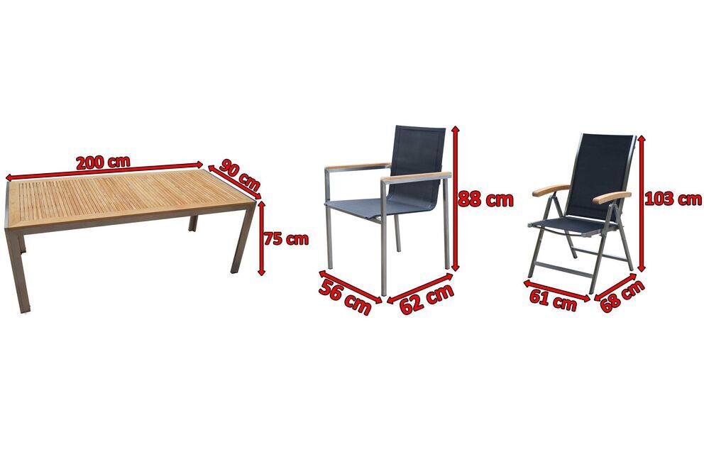 Für ein komfortables Sitzen sorgt die hochwertige textilene Bespannung, die die Sessel auch ohne Auflagen äußerst bequem macht. Außerdem sind die Klappstühle mittels Rasterschiene 4-fach verstellbar, sodass diese je nach Bedarf in eine Sitz- oder Liegeposition gebracht werden können. Das zeitlose Design aus einem rostfreien Edelstahlgestell mit einer Bespannung in der Farbe schwarz, machen die Sessel zu einem optischen Highlight für jede Terrasse. Armlehnen aus Teakholz ergänzen das edle Design. Dank der verwendeten Materialien haben die Sessel ein sehr geringes Gewicht, was ein leichtes Umstellen oder Verschieben ermöglicht. Bei Bedarf können die Sessel schnell und einfach zusammengeklappt und platzsparend verstaut werden.