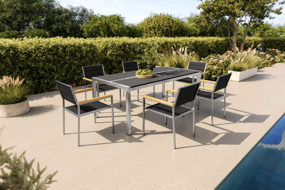 Die OUTFLEXX Garten-Essgruppe besticht nicht nur durch ihre ästhetische Erscheinung, sondern auch durch ihre außergewöhnliche Qualität. Der Tisch besteht aus hochwertigem Edelstahl und einer robusten Keramik-Tischplatte, die nicht nur witterungsbeständig ist, sondern auch eine kratzfeste und pflegeleichte Oberfläche bietet. So bleibt Ihr Tisch über Jahre hinweg in einwandfreiem Zustand, selbst bei häufigem Gebrauch im Freien. Die Kombination aus Edelstahl und Keramik sorgt für eine hohe Stabilität und Langlebigkeit – ideal für den ganzjährigen Einsatz.