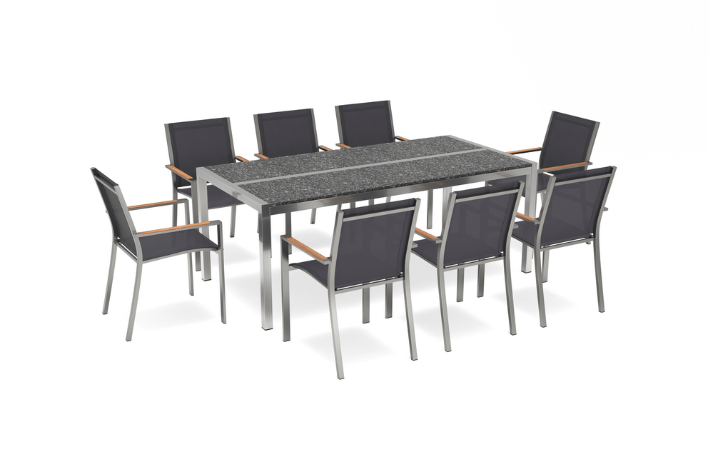 Begleitet wird der Tisch von acht komfortablen Stapelsesseln aus strapazierfähigem Textilene und FSC-zertifiziertem Teakholz. Diese Stühle sind nicht nur besonders stabil, sondern auch ergonomisch geformt und sorgen für höchsten Sitzkomfort. Mit Maßen von ca. 63 x 57 x 93 cm passen sie sich ideal an und lassen sich bei Bedarf platzsparend stapeln. Dank der wasserabweisenden Materialien und der robusten Edelstahlrahmen sind die Sessel perfekt für den ganzjährigen Einsatz im Garten geeignet.