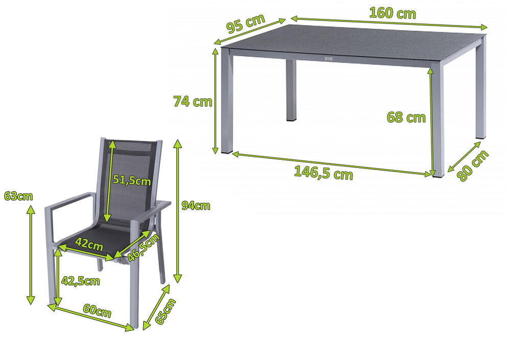 Leicht und gleichzeitig unheimlich stark: das sind die modernen Stapelsessel von OUTFLEXX®. Für das schicke und solide Gestell kommt korrosionsbeständiges Aluminium mit Pulverbeschichtung im glanzvollen Silberton zum Einsatz. Bespannt wird das Gestell mit Textilene im passenden Grauton und es sorgt für ein herrlich luftiges Sitzgefühl, das seinesgleichen sucht. Die durchgehende Sitz- und Rückenfläche ist darüber hinaus unglaublich verliert nie ihre Form. Die Gesamtmaße des Sessels liegen bei ca. 65 x 60 x 94 cm. Mit einer Sitzbreite von ca. 42 cm und einer Sitztiefe von ca. 46,5 cm sitzen Sie stets komfortabel. Bei einer Sitzhöhe von ca. 42,5 cm passt der Sessel auch unter eine Vielzahl von Tischen und bietet Ihnen genügend Beinfreiheit. Erhöhten Komfort schenken Ihnen die schlichten und zugleich markanten Armlehnen aus Aluminium, die auch optisch zu überzeugen wissen. Dank der hochwertigen Materialien und erstklassigen Verarbeitung ist der ca. 3,3 kg leichte Sessel bis zu ca. 120 kg belastbar. Sie können das Federgewicht somit auch ganz nach Bedarf an Ihren Lieblingsplätzen aufstellen oder bei Bedarf in den Schatten bringen. Zur Aufbewahrung stapeln Sie den Sessel einfach platzsparend in der Garage oder im Gartenhäuschen bis zu seinem nächsten Einsatz.