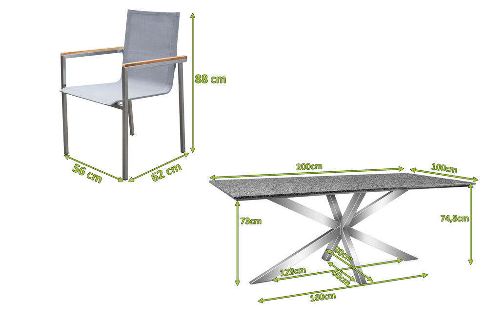 1x OUTFLEXX Esstischgarnitur, silber/anthrazit, Edelstahl/Granit/Textilene, 200x100 cm, 6 Gartensessel, Armlehnen aus Teak