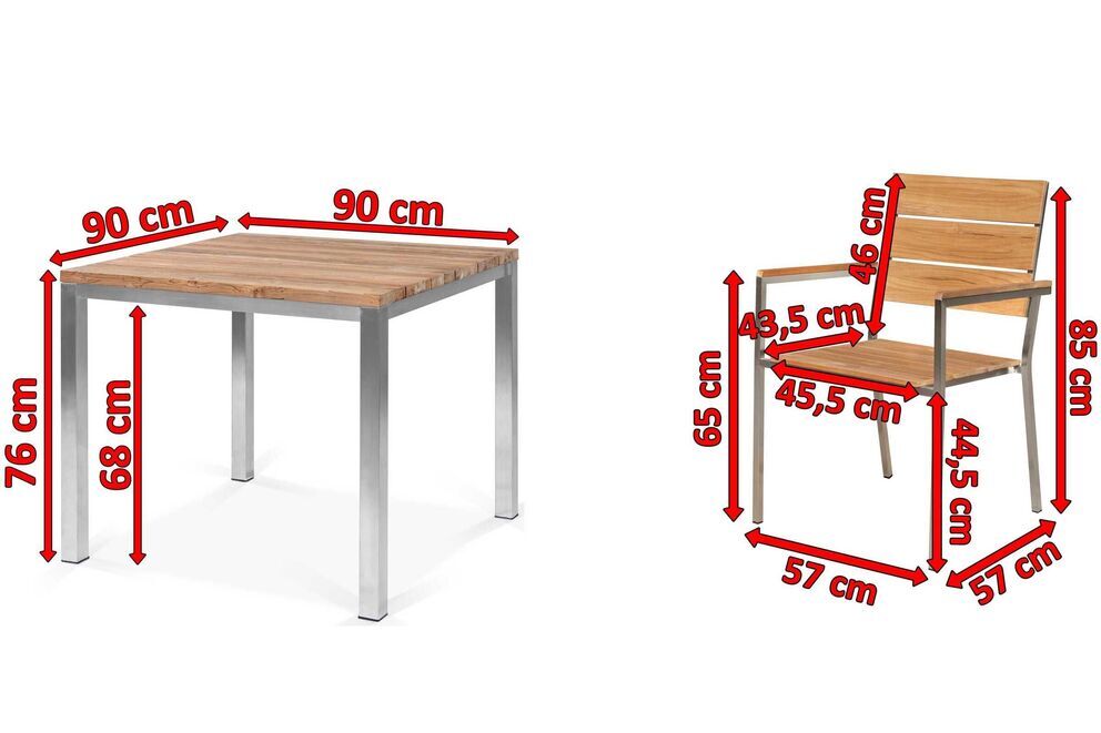 Wenn Sie sich jetzt angesprochen fühlen, sollten Sie sich diese Esstischgarnitur noch genauer anschauen. Das Set besteht aus einem Esstisch mit den Maßen von ca. 90 x 90 x 76 cm und 4 Stapelsesseln aus einer Teak/Edelstahl Kombination.