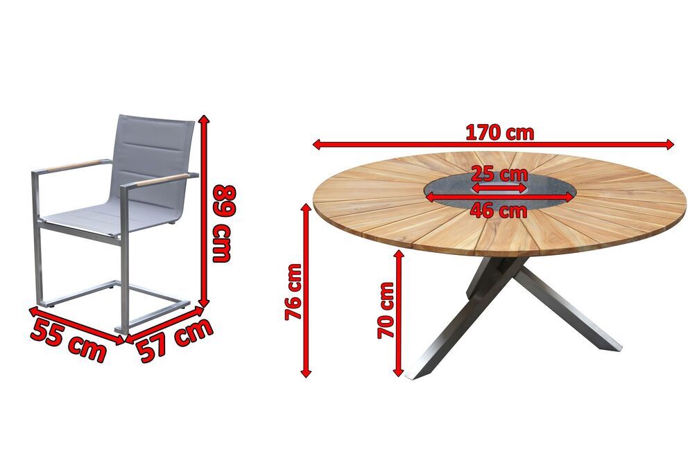 Die Besonderheit dieses Tisches liegt in der Funktionalität der Tischplatte, welche aus mehreren Komponenten besteht und für ein hohes Maß an Komfort sorgt. Die ca. Ø 170 cm große FSC®-zertifizierte Teakholztischplatte spendet genügend Platz für Teller, Gläser oder was sonst noch zu einem gemütlichen Grillabend mit der Familie gehört. Gewürze und Grillsoßen können auf dem ca. 46 cm breiten Granitring abgestellt werden. Dieser kann praktischerweise gedreht werden, sodass schwere Sachen nun nicht mehr quer über den Tisch gereicht werden müssen, sondern einfach und bequem zur anderen Seite des Tisches gedreht werden. Ein weiteres Highlight finden Sie in der Mitte der Tischplatte - eine eingefasste, herausnehmbare Edelstahlplatte kann bei Bedarf herausgenommen und durch den im Lieferumfang enthaltenen Eiskühler (ca. Ø 27 cm) ersetzt werden. So haben Sie ab sofort stets ein kühles Getränk zur Hand ohne dabei die gemütliche Runde verlassen zu müssen.