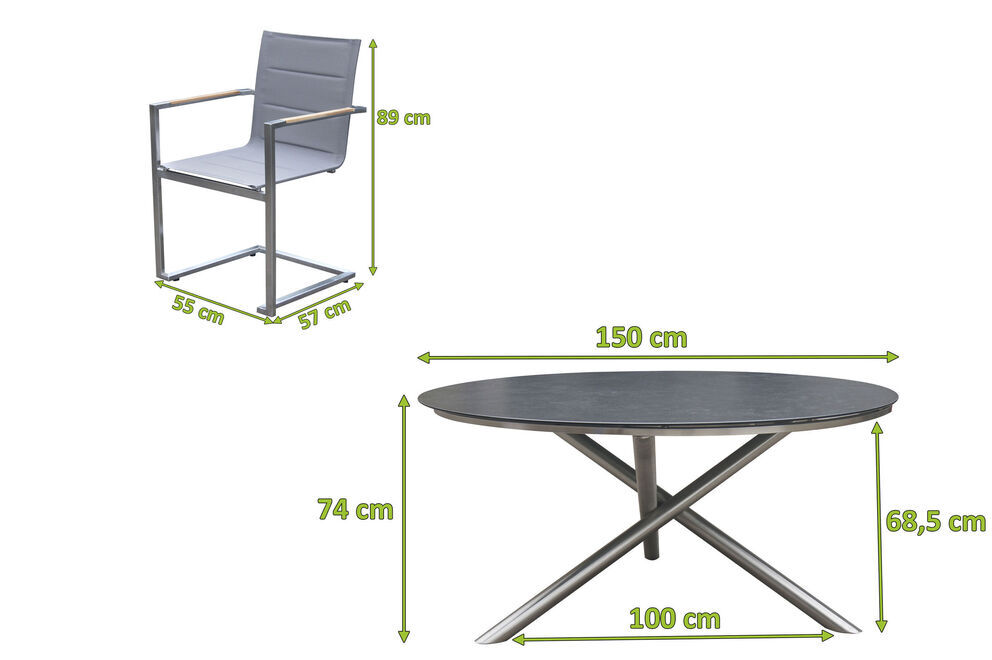 Das dreibeinige, gekreuzte Gestell des Esstisches ist gefertigt aus rostfreiem Edelstahl, welches optisch ergänzt wird durch eine hochwertige Glaskeramikplatte. Mit seinen Maßen von ca. Ø 150 x 74 cm und seinem Gewicht von ca. 49,5 kg bietet der Tisch ausreichend Platz für bis zu 4 Personen. Zum Schutz Ihrer Terrasse sind die Tischbeine zusätzlich mit Kunststofffüßen bestückt.