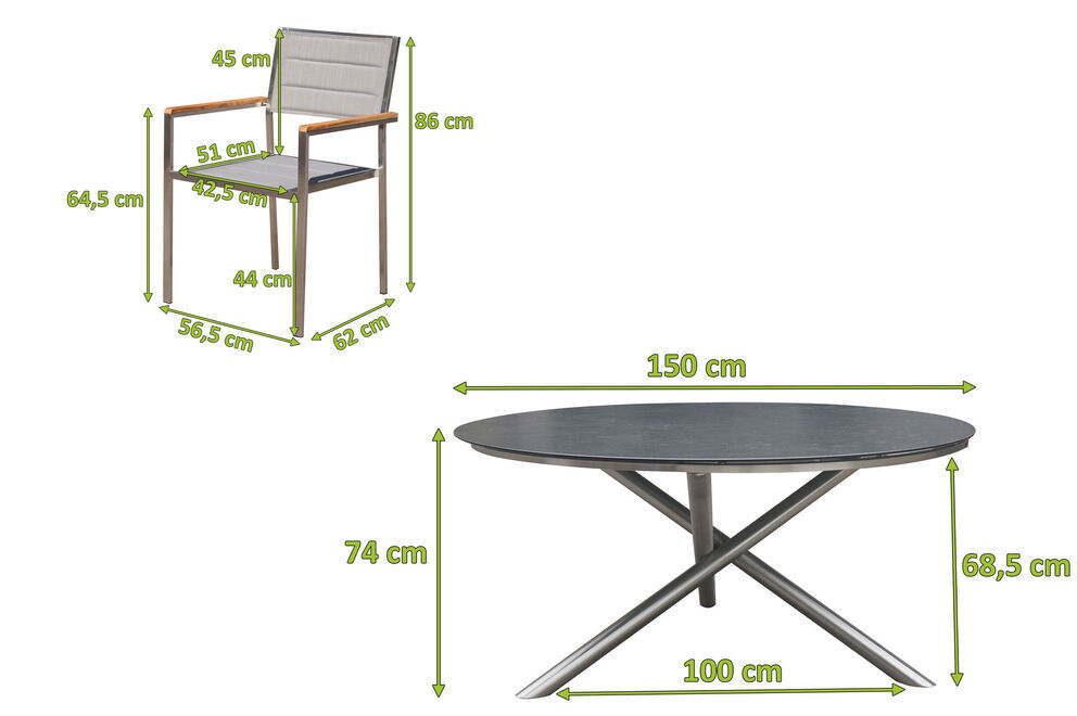 Das dreibeinige, gekreuzte Gestell des Esstisches ist gefertigt aus rostfreiem Edelstahl, welches optisch ergänzt wird durch eine hochwertige Glaskeramikplatte. Mit seinen Maßen von ca. Ø 150 x 74 cm und seinem Gewicht von ca. 49,5 kg bietet der Tisch ausreichend Platz für bis zu 4 Personen. Zum Schutz Ihrer Terrasse sind die Tischbeine zusätzlich mit Kunststofffüßen bestückt.