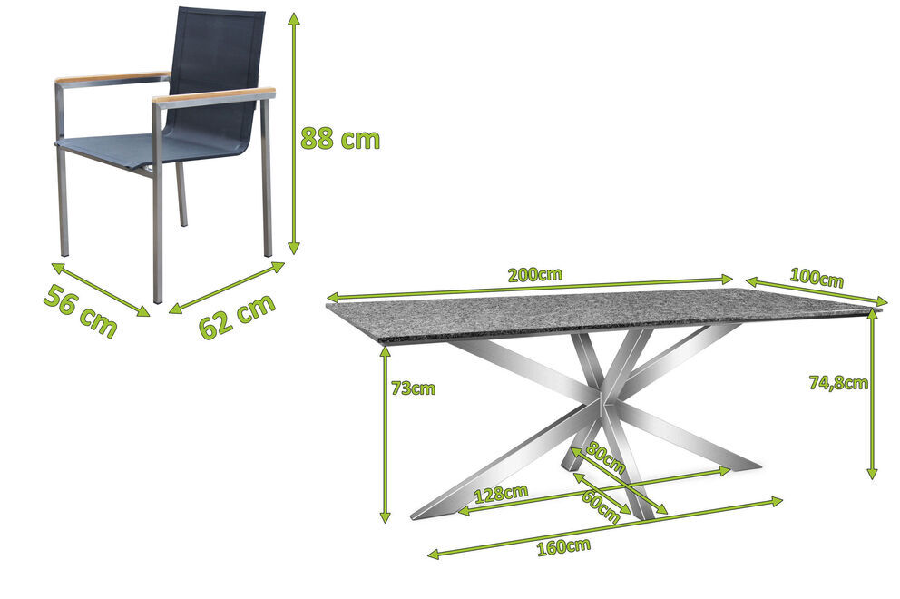 1x OUTFLEXX Esstischgarnitur, silber/anthrazit, Edelstahl/Granit/Textil, 200x100 cm, 6 Gartensessel, Armlehnen aus Teak