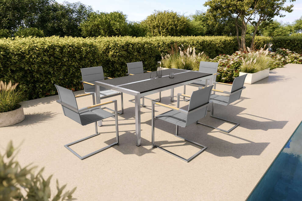 Technische Details auf einen Blick:- Tisch: Graphite, Edelstahl/Keramik, ca. 200 x 100 x 74 cm, Gewicht ca. 74 kg- Stühle: Taupe, Edelstahl/Textilene, Armlehnen aus FSC-Teakholz, ca. 55 x 57 x 89 cm, Gewicht ca. 7,1 kg pro Stuhl