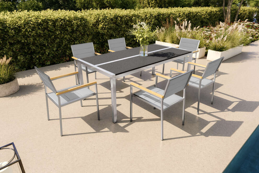 Mit der OUTFLEXX Gartenessgruppe bringen Sie Eleganz und Funktionalität in Ihren Außenbereich. Dieses hochwertige Set besteht aus einem robusten Gartentisch und sechs komfortablen Gartensesseln, die durch ihr modernes Design und ihre langlebigen Materialien überzeugen. Perfekt geeignet für entspannte Abende mit Familie und Freunden oder für besondere Anlässe im Freien, vereint dieses Set Stil und Komfort in höchster Qualität.