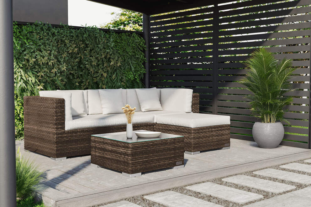 Laden Sie doch einmal wieder Freunde und Familie zu sich nach Hause ein und genießen Sie das Zusammensein. Mit dieser Sitzgruppe aus braun marmoriertem flachen Polyrattan haben Sie zukünftig Platz für bis zu 5 Personen und einem entspannten Familiensonntag oder dem spannend spaßigen Spieleabend mit Freunden steht nichts mehr im Wege.
