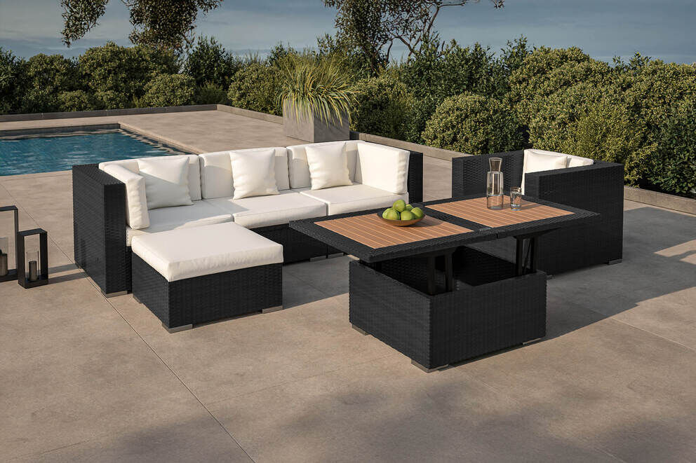 Warum sollten Sie im Garten auf Ihren gewohnten Komfort verzichten? Verlagern Sie Ihr Wohnzimmer für die Sommerzeit einfach nach draußen! Mit diesen hochwertigen Loungemöbeln aus Polyrattan geht das ganz einfach.