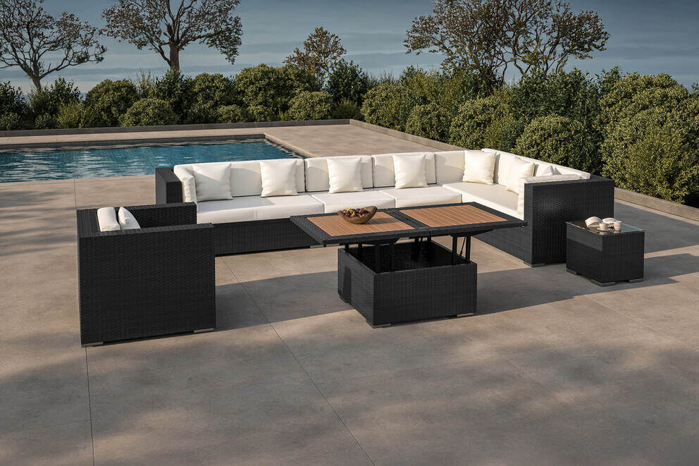 Die Loungegruppe besteht aus einem Sessel, einem 3-Sitzer Sofa, einem 2-Sitzer-Eckelement, zwei Mittelelementen, einem Beistelltisch sowie einem höhenverstellbaren Loungetisch und lässt sich variabel anordnen. Der 1-Sitzer ist mit bis zu ca. 150 kg belastbar, beim 2-Sitzer Sofa sind es ca. 300 kg und beim 3-Sitzer sogar ca. 450 kg. Was den höhenverstellbaren Loungetisch so besonders macht, ist seine Vielseitigkeit, denn er ist nicht nur als Loungetisch nutzbar, sondern lässt sich bei Bedarf mit einem einfachen Mechanismus in einen Esstisch verwandeln. Der Tisch passt sich somit ideal Ihren persönlichen Bedürfnissen an.