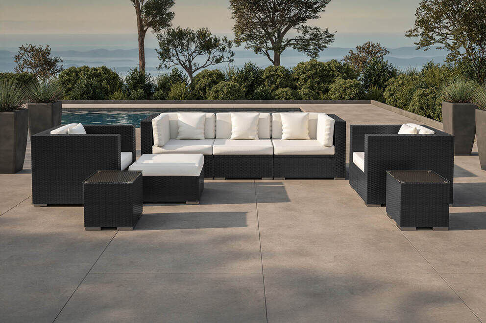 Dieses OUTFLEXX® Loungemöbel-Set aus schwarzem, flachen Polyrattan mit Sitzplätzen für bis zu sechs Personen sieht nicht nur großartig aus, sondern bietet darüber hinaus verschiedene Anordnungsmöglichkeiten.