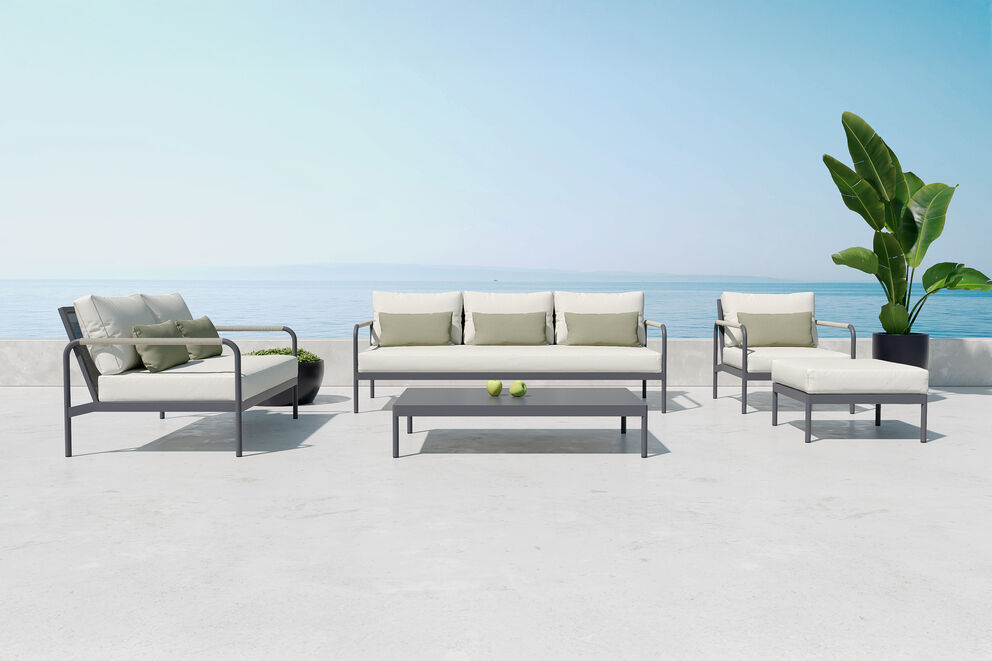 Das Gartenlounge-Set besteht aus fünf Komponenten: einem großzügigen 3-Sitzer (ca. 206 x 89 x 74 cm), einem komfortablen 2-Sitzer (ca. 140 x 89 x 74 cm), einem Single-Sofa (ca. 74 x 89 x 74 cm), einem praktischen Hocker (ca. 65 x 65 x 40 cm) sowie einem eleganten Tisch (ca. 125 x 80 x 26 cm). Jede Komponente wurde sorgfältig aus einem stabilen Aluminiumrahmen gefertigt, der nicht nur besonders leicht, sondern auch korrosionsbeständig und witterungsbeständig ist. Das zeitlose Design wird durch Armlehnen ergänzt, die mit strapazierfähigem Seilgeflecht umwickelt sind.