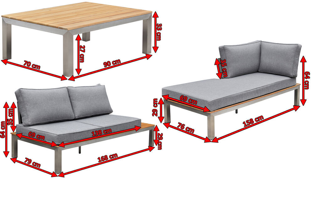 Die bewundernswerte Loungegruppe besteht aus einem 2-Sitzer Sofa, einer Chaiselounge und einem Beistelltisch. Das Gestell der Lounge wurde aus gebürstetem Edelstahl in Kombination mit FSC-zertifiziertem Teakholz angefertigt. Edelstahl eignet sich dank zahlreicher Vorteile ideal für die Herstellung von Gartenmöbeln. Das Material ist besonders stabil, witterungsbeständig, pflegeleicht und rostfrei. Das silberfarbene Gestell wird mit einer Sitzfläche aus FSC-zertifiziertem Teakholz kombiniert. Teakholz ist eine der beliebtesten Holzarten und überzeugt mit einer hohen Witterungsbeständigkeit und Haltbarkeit. Zusätzlich ist es extrem wasserabweisend. Die FSC-Zertifizierung garantiert Ihnen, dass dieses Möbelstück aus verantwortungsvollen Quellen stammt, sodass Sie sich guten Gewissens zurücklehnen und Ihre neuen Gartenmöbel so richtig genießen können. Die Sitz- und Rückenpolster wurden aus Olefin in der Farbe grau angefertigt und bieten Ihnen den perfekten Sitz- und Liegekomfort. Olefin besteht aus starken, strapazierfähigen Fasern. Die Fasern weisen eine geringe Feuchtigkeitsaufnahme auf, sodass Sie sich auch nach einem kleinen Regenschauer schnell wieder hinsetzen können. Zusätzlich ist das Material widerstandsfähig gegen Schmutz, Abnutzung, Flecken und Chemikalien.