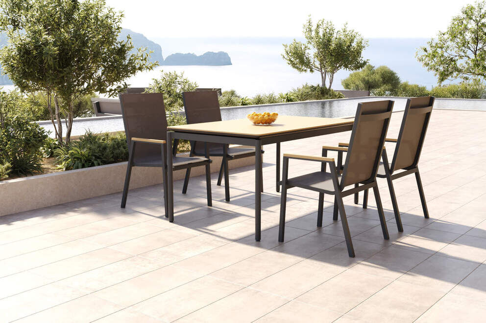 Ergänzt wird das Set durch vier OUTFLEXX Stapelstühle „Tallinn“ (Art.-Nr. 21297), die mit hohem Sitzkomfort und cleverer Funktionalität überzeugen. Die Kombination aus einem pulverbeschichteten Aluminiumgestell und einer luftdurchlässigen Textilene-Bespannung sorgt für ein angenehmes Sitzgefühl – selbst an heißen Sommertagen. Die ergonomisch geformte Rückenlehne und die stabilen Armlehnen mit einer Auflage aus Holzimitat bieten zusätzliche Bequemlichkeit. Dank ihrer Stapelbarkeit lassen sich die Stühle platzsparend verstauen, wenn sie gerade nicht im Einsatz sind. Die Maße betragen ca. 70 x 56 x 89 cm (L/B/H), die Sitzhöhe liegt bei ca. 38–43,5 cm, die Armlehnenhöhe bei ca. 57–59,5 cm. Jeder Stuhl trägt ein Gewicht von bis zu ca. 130 kg und bringt dabei nur ca. 2,68 kg auf die Waage – ein echtes Leichtgewicht mit starker Leistung.