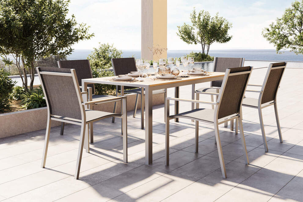 Ergänzt wird der Tisch durch sechs komfortable Stapelsessel, die durch ihre ergonomische Form und ihre edle Materialkombination aus Edelstahl, schwarzem Textilene und Teakholz begeistern. Die Sessel sind nicht nur optisch ein Highlight, sondern auch praktisch – sie lassen sich platzsparend stapeln und sind damit ideal für kleinere Terrassen oder zum Verstauen in der kalten Jahreszeit. Die Maße der Sessel betragen ca. 63 x 57 x 93 cm, mit einer Sitzhöhe von ca. 42 cm, Sitzbreite von ca. 43 cm und einer Rückenhöhe von ca. 51 cm. Jeder Sessel ist bis ca. 150 kg belastbar und bringt ein Gewicht von ca. 6,48 kg mit sich – robust und langlebig zugleich.