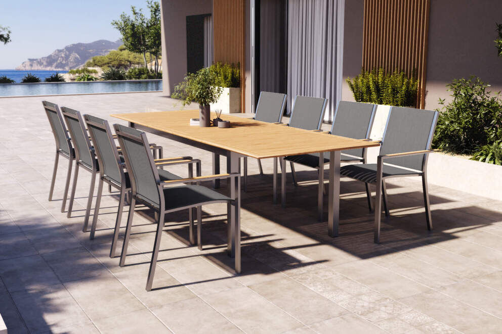 Die acht dazugehörigen Stapelsessel kombinieren ergonomisches Design mit maximaler Funktionalität. Das robuste Edelstahlgestell verleiht den Stühlen eine moderne Note, während die schwarz gehaltene Sitz- und Rückenfläche aus luftdurchlässigem Textilene für angenehmen Sitzkomfort sorgt – selbst an heißen Tagen. Die Armlehnen mit FSC®-zertifizierter Teakholz-Auflage setzen nicht nur optische Akzente, sondern fühlen sich auch angenehm warm an. Mit einer Belastbarkeit von bis zu ca. 150 kg und einem Gewicht von nur ca. 6,48 kg pro Stuhl lassen sich die Sessel leicht handhaben und platzsparend stapeln, wenn sie nicht benötigt werden.