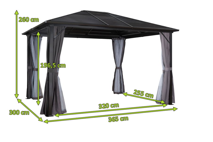Dieser moderne Hardtop Pavillon von OUTFLEXX® verschafft Ihnen mit einer Größe von ca. 300 x 365 cm eine geräumige und überdachte Oase in Ihrem Garten. Speziell für die ganzjährige Außennutzung konzipiert, besteht das Gestell aus pulverbeschichtetem Aluminium und trägt die Farbe Braun, wodurch sich der Pavillon unaufdringlich in den Garten integriert. Aluminium ist ein gern und oft verwendetes Material beim Bau von Gartenmöbeln, da es eine hohe Stabilität und Langlebigkeit aufweist. Zudem ist es ein leichtes Material, besitzt eine gute Korrosionsbeständigkeit und ist witterungsbeständig. Die Pulverbeschichtung verbessert zusätzlich die Stoß-, Schlag- und Kratzfestigkeit des Materials und verleiht dem Aluminium einen dauerhaften Korrosionsschutz und eine anhaltende Korrosionsbeständigkeit. Die massive Konstruktion hat ein Gesamtgewicht von ca. 80,7 kg und steht auf ca. 76 x 76 mm dicken Pfosten.