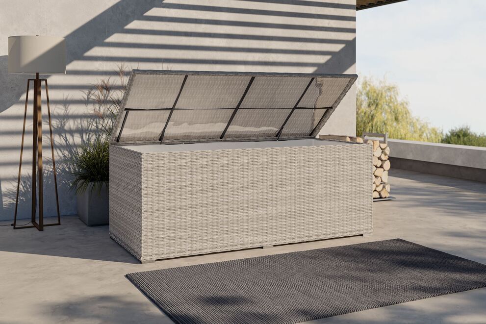 Die verwendeten Materialien wurden speziell für den Außenbereich konzipiert: Polyrattan ist UV-beständig, strapazierfähig und leicht zu pflegen. Einmal abgewischt, erstrahlt die Oberfläche im Handumdrehen wieder in neuem Glanz. Das robuste Aluminiumgestell sorgt außerdem dafür, dass Rost keine Chance hat und die Kissenbox problemlos jedes Wetter mitmacht. Regen, Wind und Feuchtigkeit können ihr kaum etwas anhaben, während Ihr wertvolles Polsterzubehör im Inneren vor Nässe geschützt bleibt.