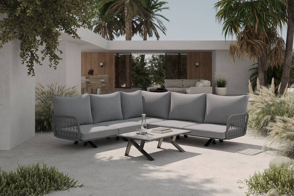 Das anthrazitfarbene Aluminiumgestell in Kombination mit den grauen Kissen verleiht der Lounge eine moderne, klare Optik. Das seitliche Rope-Geflecht setzt attraktive Akzente und unterstreicht den hochwertigen Charakter des Sets. Die zeitlose Gestaltung fügt sich harmonisch in verschiedenste Terrassen- und Gartenstile ein und wirkt zugleich elegant und einladend. |