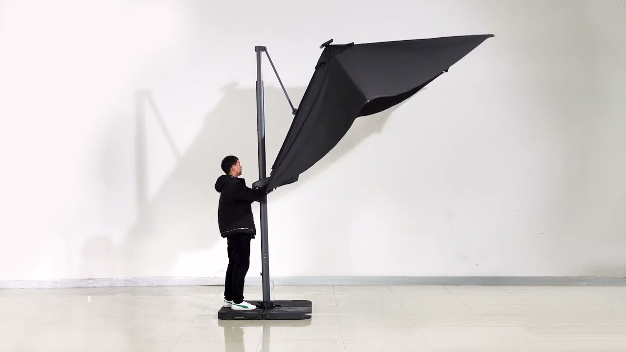 Der Ampelschirm von OUTFLEXX passt sich dank seiner großzügigen Maße von ca. 300 x 300 cm und dem Schirmtuch in schwarz perfekt an Ihre Terrasse oder Ihren Balkon an.