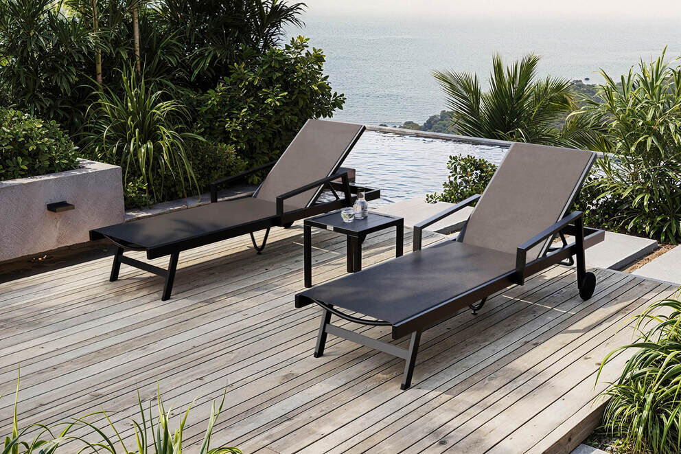 Für Sonnenanbeter ist dieses langlebige und formschöne Sonnenliegenset von OUTFLEXX® genau das Richtige. Es besteht aus 2 Liegen mit einer Textilenbespannung in der Farbe anthrazit und einem Beistelltisch aus Teakholz mit den ca. Maßen von 40 x 40 cm.