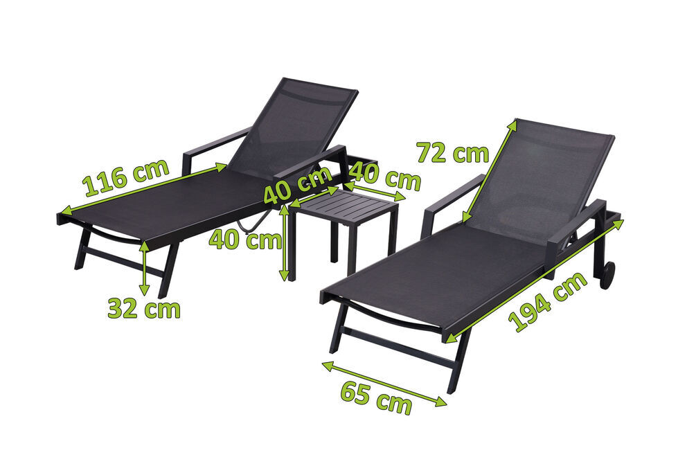 Die edlen und zeitlosen Sonnenliegen machen sowohl in Sachen Komfort als auch in Sachen Optik eine gute Figur. Das Gestell aus rostfreiem pulverbschichteten Aluminium wird ergänzt durch eine Textilenbespannung in der Farbe anthrazit, außerdem bieten Ihnen die Liegen mit den Maßen von ca. 194 x 65 x 32 cm, einer maximalen Belastbarkeit von ca. 120 kg je Liege und einer mehrfach verstellbaren Rückenlehne optimalen Liegekomfort. Rollen an den hinteren Beinen sorgen für ein einfaches Bewegen der Liegen.
