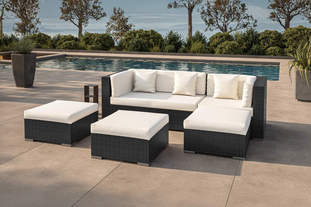 Laden Sie doch einmal wieder Freunde und Familie zu sich nach Hause ein und genießen Sie das Zusammensein. Mit dieser Sitzgruppe aus schwarzem, flachen Polyrattan haben Sie zukünftig Platz für bis zu 5 Personen und einem entspannten Familiensonntag oder dem spannend spaßigen Spieleabend mit Freunden steht nichts mehr im Wege.