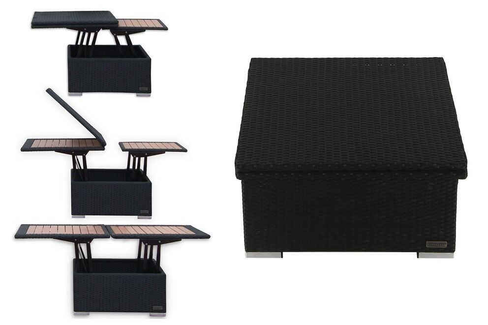 Das Aluminiumgestell dieses Tisches ist mit der schwarz geriffelten Polyrattanfaser umflochten. Die Tischplatte besteht aus Kunststofflatten in Holzoptik, diese verleihen dem Tisch einen edlen Charakter und sind zudem besonders pflegeleicht. Der Clou ist jedoch, dass sich der Tisch ganz einfach vergrößern und in Esstischhöhe einstellen lässt. Einfach die Tischplatte aufklappen und das Scherengestell hochziehen - schon können Sie mit vier Personen an diesem Tisch in bequemer Höhe tafeln. Aufgeklappt hat der Tisch eine Höhe von ca. 64,5 cm und eine Länge von ca. 152 cm. Zur Rückverwandlung schieben Sie einfach die Einrasthebel zurück, so dass sich das Gestell einfach zusammenklappen lässt.