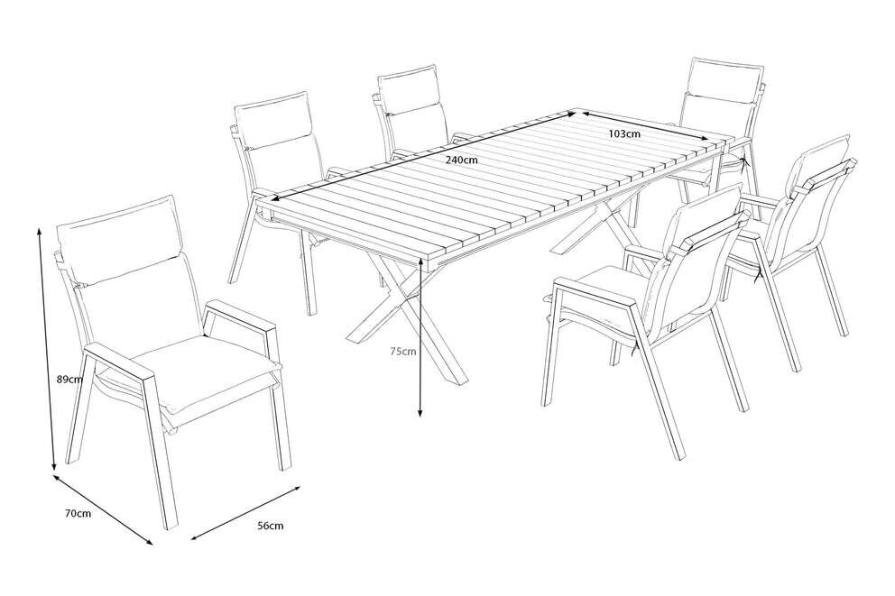 Die sechs zugehörigen OUTFLEXX Tallinn Stapelstühle setzen das Designkonzept konsequent fort. Ihr pulverbeschichtetes Aluminiumgestell in Anthrazit matt harmoniert perfekt mit den schwarzen Textilene-Sitz- und Rückenflächen, die durch ihre Luftdurchlässigkeit auch an warmen Tagen für hohen Sitzkomfort sorgen. Die Armlehnen in natürlicher Holzoptik fügen einen warmen, einladenden Akzent hinzu. Mit einem Gewicht von nur ca. 2,68 kg pro Stuhl lassen sich die Stühle leicht bewegen und dank der Stapelfunktion platzsparend verstauen. Gleichzeitig überzeugen sie durch ihre Stabilität und eine Belastbarkeit von ca. 130 kg.