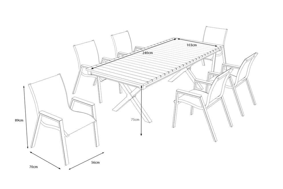 Die sechs Tallinn Stapelstühle ergänzen den Tisch harmonisch und bieten einen hohen Sitzkomfort. Das pulverbeschichtete Aluminiumgestell in anthrazit matt wirkt besonders modern, während die Armlehnen aus Holzimitat einen stilvollen Akzent setzen. Die schwarze Textilene-Bespannung ist luftdurchlässig, angenehm flexibel und ideal für warme Tage im Freien. Mit einer Belastbarkeit von ca. 130 kg und ihren durchdachten Proportionen (ca. 70 x 56 x 89 cm) sind die Stühle stabil, leicht und zugleich platzsparend stapelbar. Die Sitzhöhe von ca. 38–43,5 cm, die Rückenlehnenhöhe von ca. 50 cm und die ergonomisch geformte Sitzfläche sorgen für bequemes Sitzen über viele Stunden.
