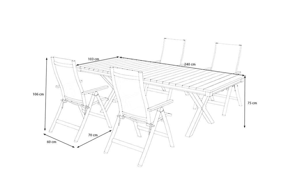 Der Herzstück des Sets ist der elegante Esstisch mit einem X-Gestell aus pulverbeschichtetem Aluminium. Das robuste Gestell verleiht dem Tisch eine hohe Stabilität, ist korrosionsbeständig und ideal für den dauerhaften Einsatz im Freien geeignet. Die Tischplatte aus hochwertigem Holzimitat in natürlicher Optik sorgt für einen warmen, einladenden Charakter – perfekt, um Ihren Garten oder Ihre Terrasse optisch aufzuwerten. Ein besonderes Highlight ist die integrierte LED-Lichtleiste im Tischrahmen, die in kaltweißem Licht erstrahlt und eine einzigartige Atmosphäre schafft. Der beleuchtete Rahmen wirkt nicht nur modern, sondern ist zugleich ein echter Blickfang für Abende im Freien.