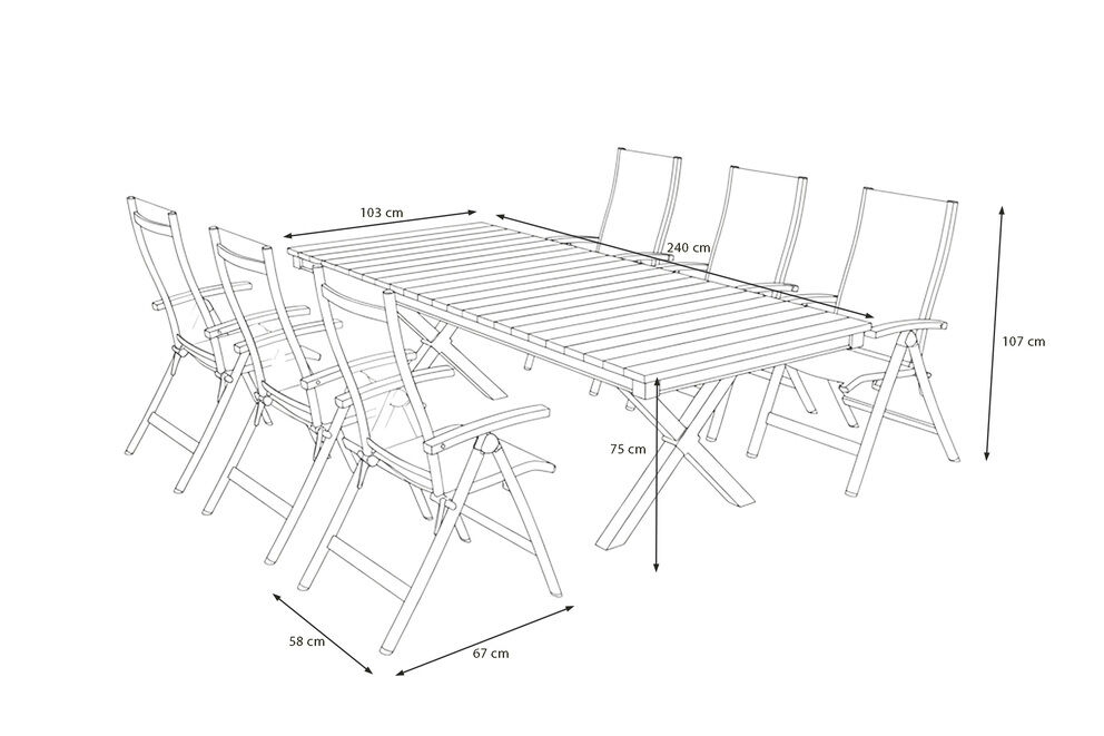 Der ca. 240 x 103 cm große Tisch bietet großzügig Platz für bis zu sechs Personen. Dank der großzügigen Unterhöhe von ca. 66,5 cm können Stühle bequem untergestellt werden. Ob Familienessen oder Gartenparty – die Essgruppe schafft Raum für gemeinsame Momente und stilvolles Beisammensein. |