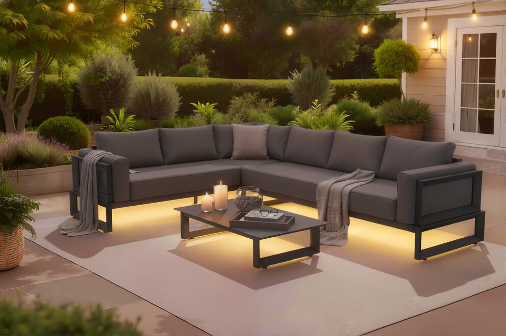 Die OUTFLEXX Luminara LED-Gartenlounge verwandelt Ihre Terrasse, Ihren Balkon oder den Garten in eine exklusive Wohlfühloase. Das moderne Design in anthrazit und dunkelgrau kombiniert mit hochwertigen Materialien sorgt nicht nur für ein elegantes Erscheinungsbild, sondern auch für hohen Komfort und Langlebigkeit. Dank der integrierten LED-Beleuchtung entsteht eine stimmungsvolle Atmosphäre, die Ihre Abende im Freien perfekt abrundet.