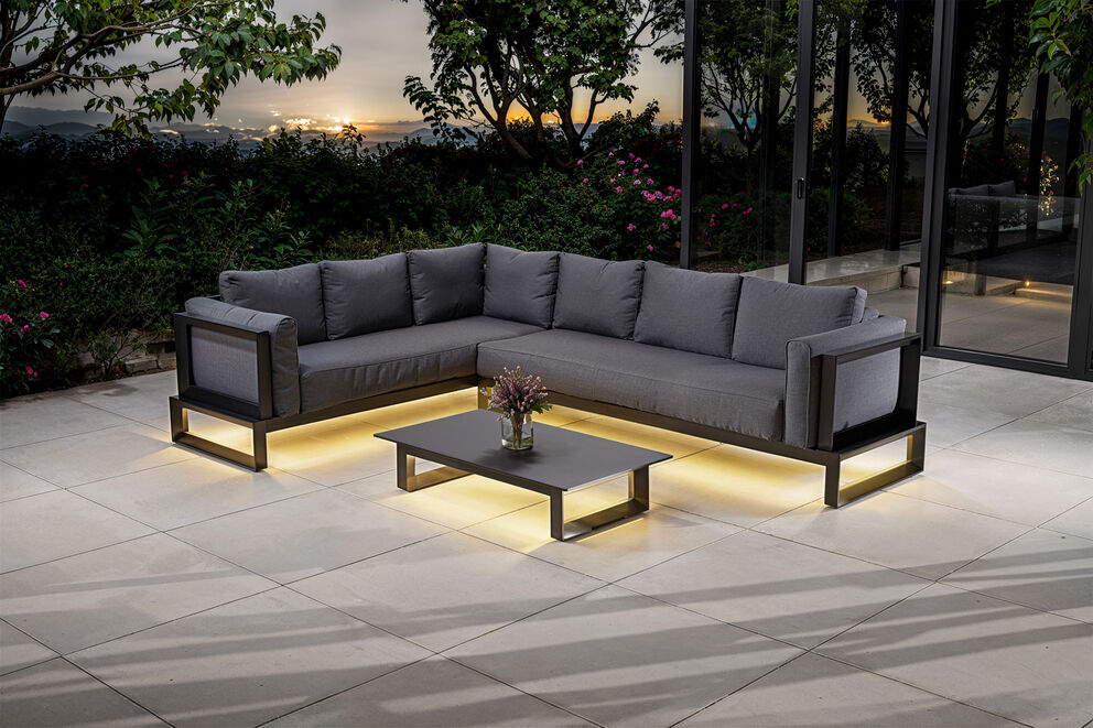 Die OUTFLEXX Luminara LED-Gartenlounge überzeugt durch ihr modernes, geradliniges Design in edlem Anthrazit und Dunkelgrau. Sie fügt sich harmonisch in jedes Garten- oder Terrassenambiente ein und schafft einen stilvollen Rückzugsort im Freien. Das ansprechende Farbkonzept verleiht Ihrem Außenbereich eine elegante, zeitlose Note – perfekt für anspruchsvolle Gartenliebhaber mit Sinn für Design. |