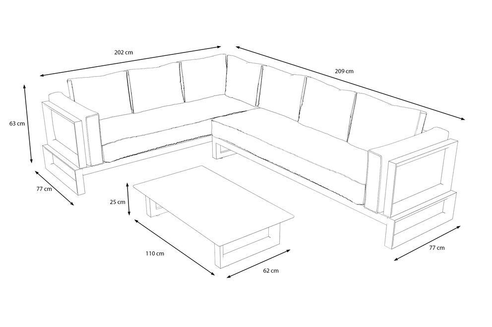 Die Lounge besteht aus zwei komfortablen Sofaelementen (ca. 202 × 77 × 63 cm und ca. 209 × 77 × 63 cm) sowie einem passenden Loungetisch (ca. 110 × 62 × 25 cm). Der Tisch bietet ausreichend Platz für Getränke, Snacks oder Dekorationselemente und ist dank seiner niedrigen Höhe perfekt auf die Sitzmöbel abgestimmt. Mit einem Gewicht von ca. 9,1 kg ist er stabil, aber dennoch leicht genug, um bei Bedarf schnell umgestellt zu werden.