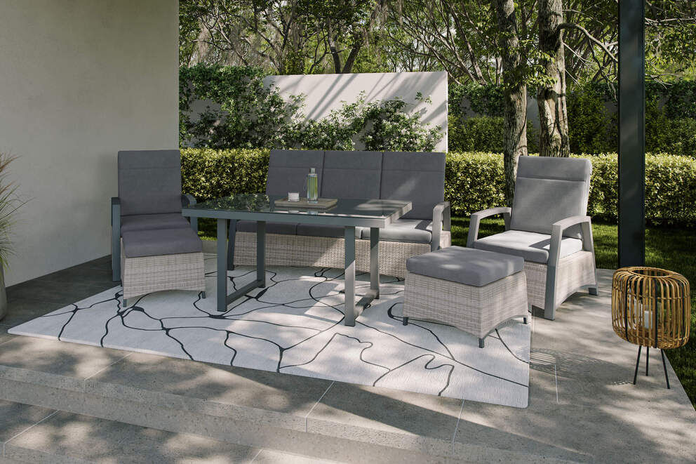 Genießen Sie Ihre Outdoor-Oase mit dem hochwertigen Loungemöbel-Set von OUTFLEXX. Dieses stilvolle Set kombiniert modernes Design mit erstklassiger Funktionalität, um Ihrem Garten, Ihrer Terrasse oder Ihrem Balkon eine luxuriöse Note zu verleihen. Es besteht aus einem großzügigen Dreisitzer-Sofa, zwei Loungesesseln, einem Loungetisch und zwei komfortablen Hockern, die perfekt aufeinander abgestimmt sind und maximale Entspannung bieten.