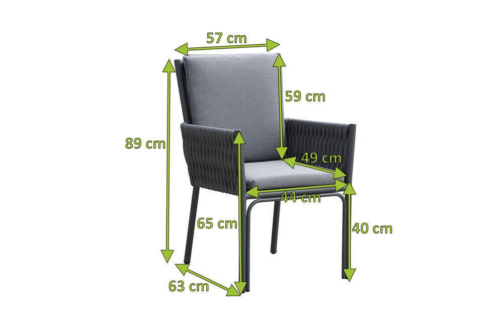 Der bequeme Sessel verfügt über ein Gestell aus Aluminium und die Sitz- und Rückenfläche ist bespannt mit Polyrattangeflecht OUTFLEXX® XL Geflecht (Tube Wicker ca. 3 x 4 cm dick ). Mit den Maßen von ca. 57 x 63 x 89 cm und einem Gewicht von ca. 6,3 kg bietet dieser Sessel genügend Platz um es sich so richtig gemütlich zu machen. Abgerundet werden die gemütlichen Stunden durch die komfortablen aus Polyester gefertigten grauen Sitz- und Rückenpolster mit einer Dicke von ca. 5 cm, sodass Sie gar nicht mehr aufstehen möchten. Die Bezüge der Polster sind abnehmbar und können auch gewaschen werden, falls diese einmal dreckig werden. Die angepasste Sitzhöhe inklusive Polster von ca. 40 cm bringt Ihre Sitzgelegenheiten in perfektem Einklang zu jedem Esstisch.