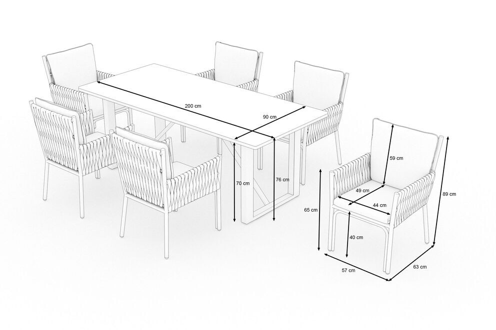 Das Set besteht insgesamt aus einem Esstisch und sechs hochwertigen Stühlen. Der Tisch ist ca. 200 cm lang und ca. 90 cm breit und bietet somit genügend Platz für einen schönen Grillabend mit Freunden oder der Familie. Der Tisch wiegt ca. 47,6 kg und die Tischplatte ist aus Keramikglas hergestellt worden. Die Tischplatte ist ca. 6 cm dick. Das hochwertige Aluminiumgestell wurde sowohl bei dem Tisch als auch bei den Stühlen pulverbeschichtet und kommt in einem eleganten Anthrazit daher. Die Pulverbeschichtung sorgt für längere Haltbarkeit und Witterungsbeständigkeit. Die bequemen Stühle haben ebenfalls ein Gestell aus Aluminium und die Sitz- und Rückenfläche ist bespannt mit Polyrattangeflecht OUTFLEXX® XXL ( ca. 3 x 4 cm dick ). Mit den Maßen von ca. 57 x 63 x 89 cm und einem Gewicht von ca. 6,3 kg bietet dieser Stuhl genügend Platz um es sich so richtig gemütlich zu machen. Abgerundet werden die gemütlichen Stunden durch die komfortablen aus Polyester gefertigten grauen Sitz- und Rückenpolster mit einer Dicke von ca. 5 cm, sodass Sie gar nicht mehr aufstehen möchten. Die Bezüge der Polster sind abnehmbar und können auch gewaschen werden, falls diese einmal dreckig werden. Die angepasste Sitzhöhe inklusive Polster von ca. 45 cm bringen Tisch und Sitzgelegenheiten in perfektem Einklang.