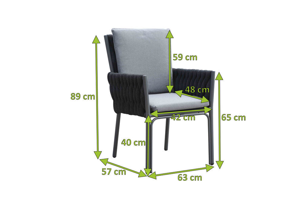 Der bequeme Sessel verfügt über ein Gestell aus Aluminium und die Sitz- und Rückenfläche ist bespannt mit XL Ropegeflecht und entpricht modernster Kordeloptik. Mit den Maßen von ca. 57 x 63 x 89 cm und einem Gewicht von ca. 8,9 kg bietet dieser Sessel genügend Platz um es sich so richtig gemütlich zu machen. Abgerundet werden die gemütlichen Stunden durch die komfortablen aus Polyester gefertigten grauen Sitz- und Rückenpolster mit einer Dicke von ca. 5 cm, sodass Sie gar nicht mehr aufstehen möchten. Die Bezüge der Polster sind abnehmbar und können auch gewaschen werden, falls diese einmal dreckig werden. Die angepasste Sitzhöhe ca. 40 cm bringen Ihre Sitzgelegenheiten in perfektem Einklang zu jedem Esstisch.