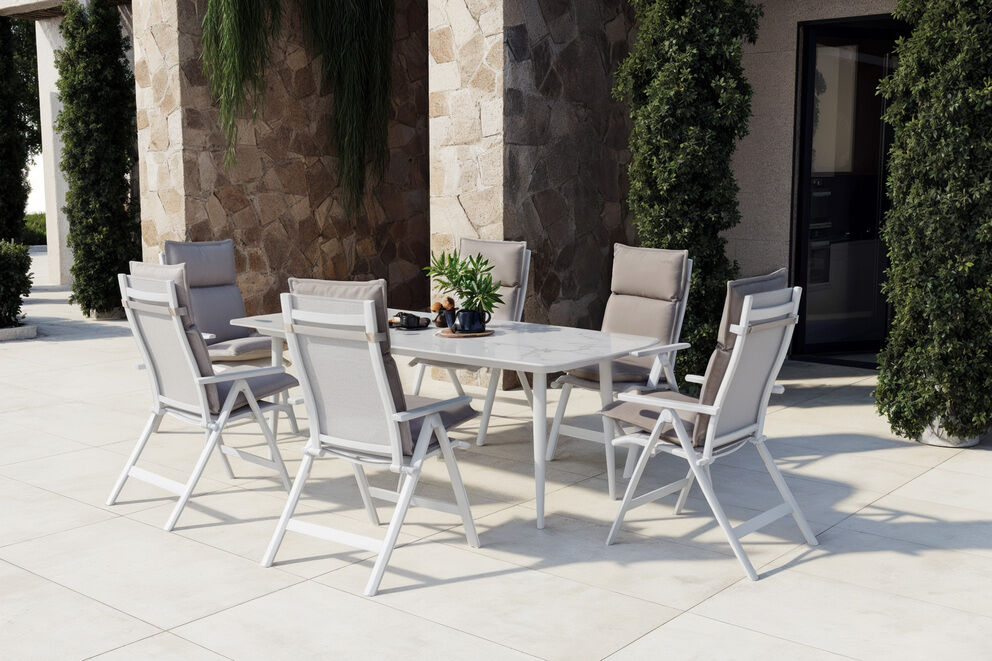 Im Zentrum der Essgruppe steht der großzügige Esstisch mit einer Größe von ca. 220 x 100 x 75 cm. Das weiß pulverbeschichtete Aluminiumgestell bietet nicht nur eine elegante Optik, sondern auch eine robuste und korrosionsbeständige Basis. Die Tischplatte aus Glas in edler Keramikoptik in Weiß verleiht dem Tisch einen besonders hochwertigen Charakter und ist zudem pflegeleicht und wetterfest. Abgerundet wird das Design durch elegante Fußkappen, die für zusätzliche Stabilität sorgen und empfindliche Böden schützen.