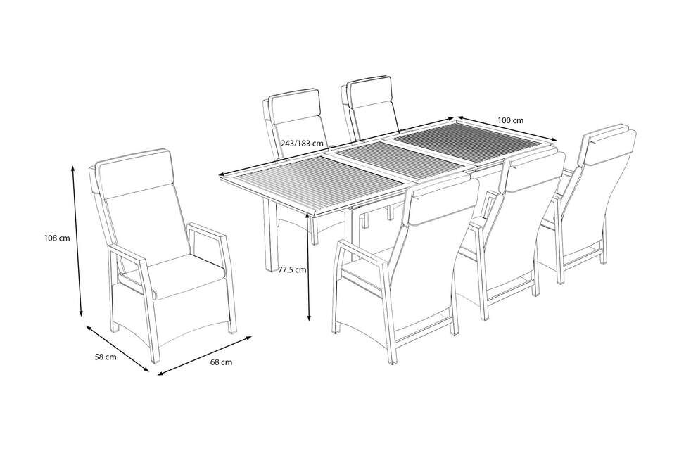 Der Mittelpunkt der Essgruppe ist der OUTFLEXX Premium Ausziehtisch in elegantem Anthrazit. Das Gestell aus pulverbeschichtetem Aluminium ist nicht nur stabil und robust, sondern auch pflegeleicht. Die Tischplatte aus edlem Teakholz sorgt mit ihrer warmen Farbgebung für eine natürliche Note und bildet einen stilvollen Kontrast zum dunklen Gestell. Dank des praktischen Ausziehmechanismus lässt sich der Tisch mühelos von ca. 183 cm auf ca. 243 cm verlängern und bietet so ausreichend Platz für Familie und Gäste. Mit einer Breite von ca. 100 cm und einer Höhe von ca. 77,5 cm lädt der Tisch zum komfortablen Speisen und geselligen Beisammensein ein. Details wie die ca. 2 cm dicke Tischplatte und die durchdachten Abstände zwischen den Tischbeinen gewährleisten eine angenehme Beinfreiheit.