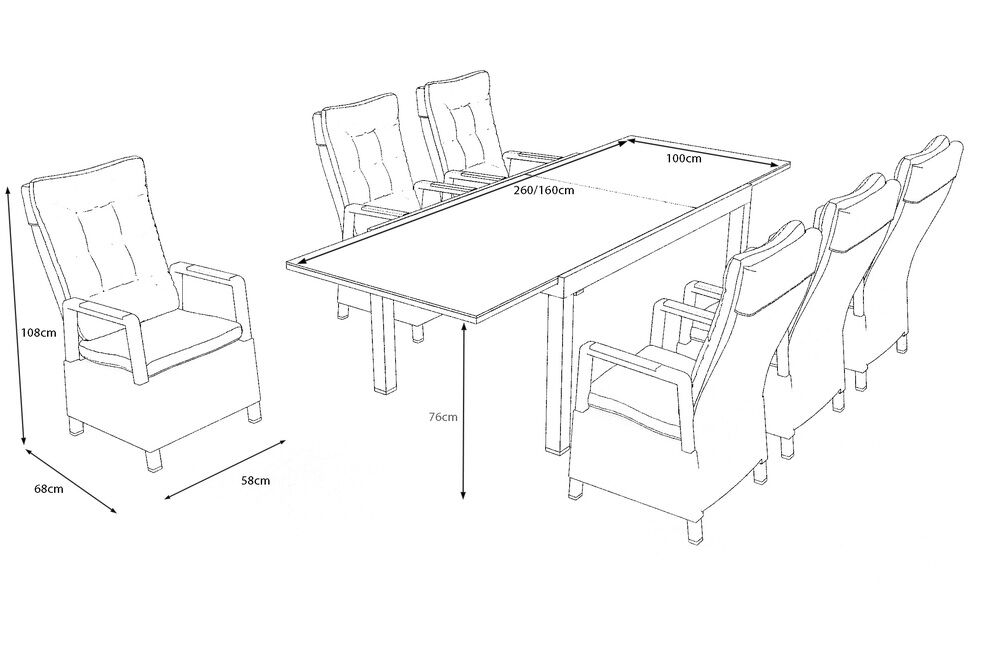 Gemeinsam bilden Tisch und Sessel eine harmonische Einheit, die durch ihre Materialien, Farbtöne und hochwertige Verarbeitung überzeugt. Die Essgruppe lässt sich leicht reinigen, flexibel einsetzen und bietet dank der verstellbaren Funktionen einen besonders hohen Komfort im Alltag. Ob für Familienfeiern, gemütliche Abende mit Freunden oder ein entspanntes Frühstück im Freien – dieses Set schafft den perfekten Rahmen für jeden Anlass.